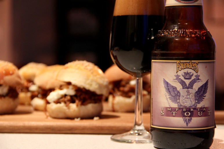 Við byrjum á marineringunni því þetta þarf helst að liggja á kjötinu í sólarhring. Þannig að daginn fyrir veisluna þá gerum við eftirfarandi. Kryddið kjötið ríkulega með salti og pipar, nuddið inn í kjötið. Nuddið svo Sriracha sósunni á báðar hliðar kjötsins, kryddið aðeins með reyktri papriku. Setjið kjötið í ílát með loki og hellið svo stout yfir kjötið og inn í kæli. Allt í lagi að stela einum sopa hér, Founders imperial stout er bara svo magnaður. Þegar ca helmingur tímans er liðinn þá er ágætt að snúa sneiðunum við t.d. næsta morgun.