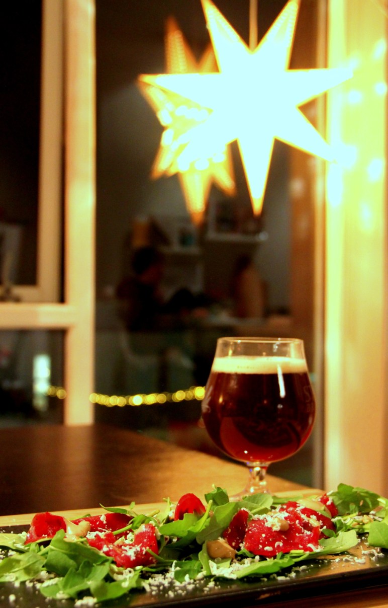 Grafna lambið er svo mildari útgáfa af þessum herlegheitum, hér er maður alveg laus við reykta keiminn ef hann truflar fólk. Kjötið er mjúkt og djúsí og bráðnar alveg í munni. Það er ögn selta í því og pipar en svo blandast sætur hunangs kryddkeimur frá graflaxsósunni við ásamt beiskju frá stökku klettasallatinu. Osturinn toppar þetta svo algjörlega, þurr, ögn saltur með notalega jörð. Leifur frá Borg er mjög viðeigandi hérna en Ginger Brett IPA frá Mikkeller er svakalega skemmtilegur jólabjór. Um er að ræða IPA með villigerinu Brettanomyces sem gefur alveg einstakt „funky“ bragð og svo er engifer í þessu sem skín vel í gegn. Bjórinn er þannig ögn beiskur með þessum skemmtilega funky keim sem ekki er hægt að lýsa og svo er engiferið áberandi. Virkilega skemmtilegt ofan á lambið og skapar dálítið nýja vídd í þessu.