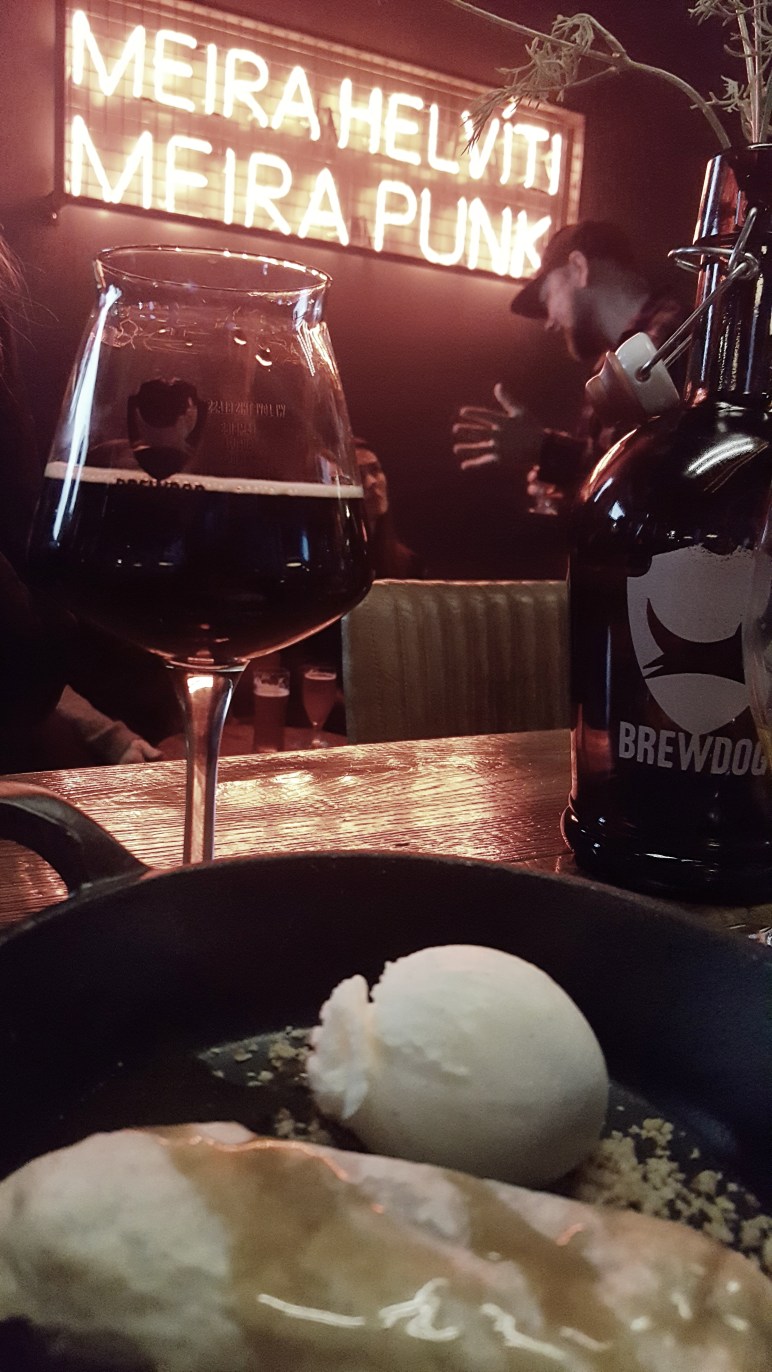 Það er óhætt að mæla með rifna andalærinu sem parast einkar vel með Elvis Juice sem er ljúfur vínberja IPA sem skapar skemmtilegt léttvægi á móti jarðbundu andalærinu, virkilega flott. Svo prófuðum við kjúklinga vöfluréttinn með eggi og spicy majo. Ofsalega skemmtilegur réttur á sætu nótunum en þó með nettum hita. Hér kemur 5am Saint mjög vel út en áberandi maltkarakterinn í bjórnum tengir vel við sætuna í þessum rétti en humlabeiskjan tónar þetta þó niður og skapar gott jafnvægi. Við enduðum svo kvöldið með konungi imperial stout bjóra, Tokyo sem er rétt rúmlega 16% imperial stout af allra allra bestu sort. Þetta er þrusu bjór með mikinn hita og karakter en heilmikla sætu líka. Við hefðum getað klárað þetta með bjórnum einum saman enda stendur hann fyllilega fyrir sínu sem flottur eftirréttur út af fyrir sig en við ákváðum að láta vaða í Mars Bar Wellington sem er mars súkkulaði stykki sem er bakað í smjördeigi með Jet Black Heart karamellu, haframulningi og Madagascar vanillu rjómaís. Þetta er sturlað combo og alls ekki fyrir viðkvæmar sálir með mikla líkamsvitund. Maður þarf ekki að broða í viku eftir þetta monster. Fínt til að deila 🙂