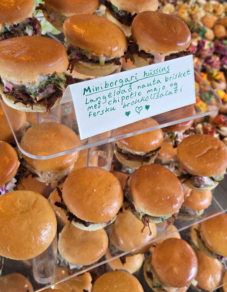 Við frúin vorum með útskriftar veislu fyrir son okkar í gær og ákváðum að gera sjálf einhverja rétti en kaupa þó flesta réttina því maður hefur jú ekki endalausan tíma. Mig langaði að prófa að gera smáborgara eins og ég myndi vilja fá þá. Þetta var niðurstaðan og þeir fengu frábæra dóma gesta. Lang vinsælasti rétturinn og kláruðust rúmlega 100 borgarar langt á undan öllu öðru. Hér er eins og ég gerði þetta. Ég skal viðurkenna það að það er gott að hafa einn eða tvo með sér að raða þessu saman, við vorum tvö í þessu og það gekk samt furðu hratt.