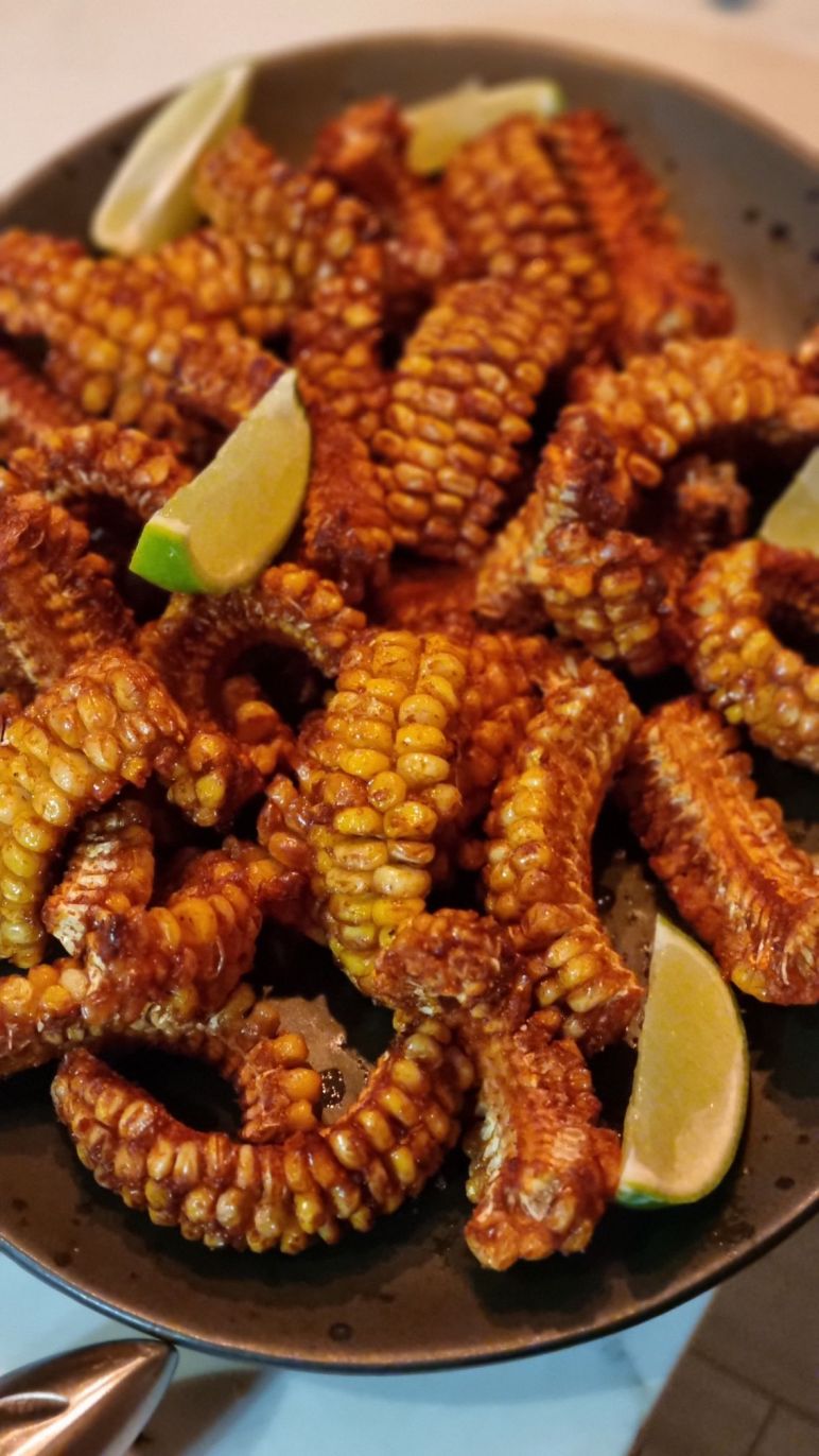 • 4 maískólfar skornir til helminga svo aftur í fernt eftir endilöngu