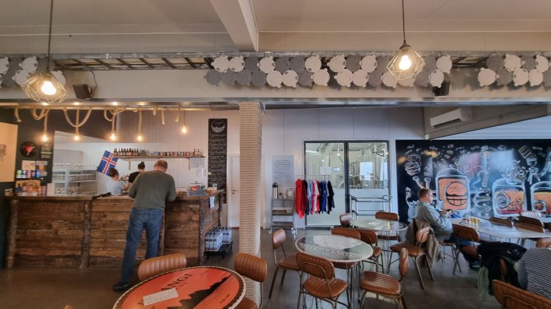 Dokkan er skynsamlega staðsett við höfnina þar sem stóru farþegaskipin leggja að og því tryggður ákveðinn straumur viðskiptavina ekki bara um helgar heldur virkum dögum líka.  Þetta er huggulegur staður sem serverar bæði mat og bjór af 12 krönum.  Það er líka myndarlegur dósakælir upp við einn vegginn.  Svo eru stórar glerrúður sem gefa gestum innsýn inn í sjálft brugghúsið þar sem galdrarnir gerast.