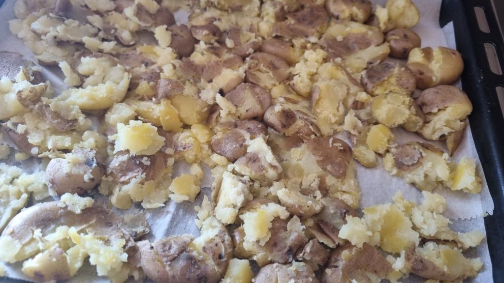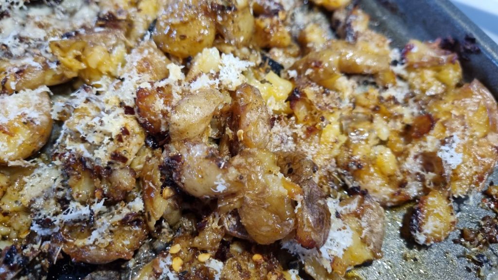 Takið kartöflurnar og kremjið þær þannig að þær opnist (sjá mynd), setjið svo í eldfast mót eða á ofnplötu. Fínt að nota glas til að kremja kartöflurnar. Hellið brúna kryddsmjörinu yfir, kryddið með smá salti og pipar og chilli flögum og bakið í ofni við 200 gráður þar til kartöflurnar eru orðnar stökkar. Hér getið þið í raun stoppað ef þið viljið, þessar kartöflur svona eru geggjað meðlæti. Ég myndi þá rífa yfir þær parmesan ost og svo aðeins aftur í ofn.