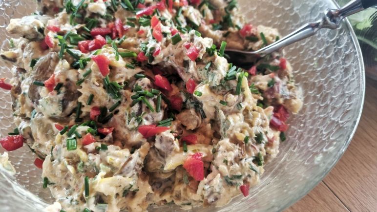 Skerið kartöflurnar aðeins niður og blandið svo öllu saman í fallega skál. Það er smart að dreifa saxaðri rauðri papríku og steinselju yfir en auðvitað er það ekkert möst svo sem.