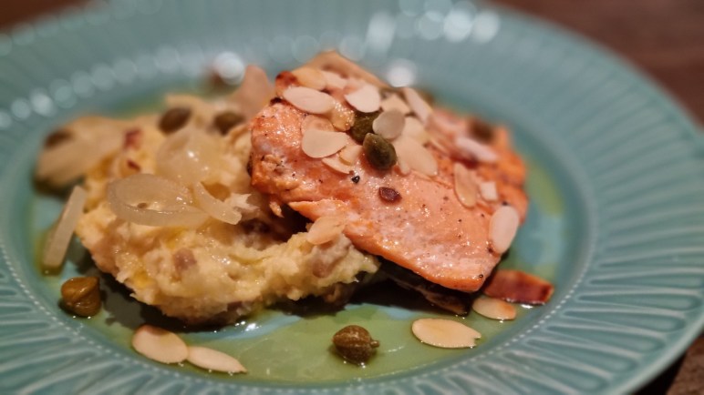Best að byrja á möndluflögunum (3-4 mtsk). Ristið þær á pönnu og leggið til hliðar. Svo er það smjörið (um 75g), brúnið það í potti, passa bara að brenna það ekki, við viljum fá dulitla hnetu/karamellu lykt af því. Takið til hliðar, bætið 2 tsk kapers útí. Skera niður stóran lauk í sneiðar og mýkið á pönnu í smjöri. Bætir þessu svo út í brúna smjörið.