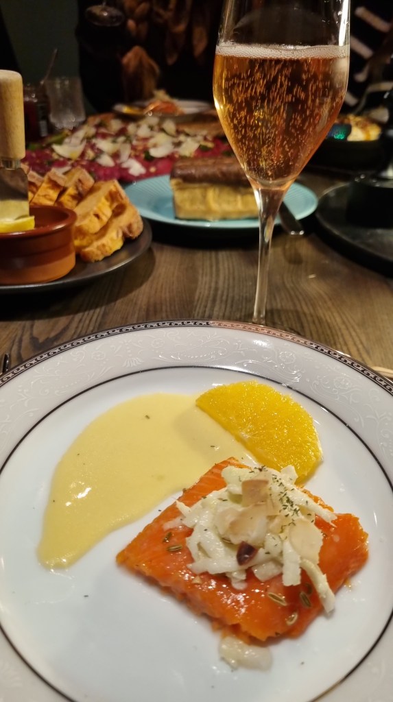 Við smökkuðum nokkra rétti, allt frábært. Tuna tartar með lárperumauki sem var ljómandi gott þó svo að dóttir okkar tilkynnti okkur að okkar heimalagaða tuna tartar væri enn betra. Svo var það nauta carpaccio sem klikkar bara ekki, einn í hópnum fékk sér gráðosta gnocchi sem var með því betra sem maður hefur smakkað í þeim geira, svo ríkulegt bragð af ostinum og gnocchi koddarnir svo lungna mjúkir og dásamlegir. Svo var það white duck ragu með pappardelle pasta, þvílíkt ljúfmeti, ég hafði ekki smakkað þennan frábæra rétt áður. Loks fékk ég mér nauta filet með foi gras og púrtvíns demiglace. Ég er ekki að ýkja þegar ég segi, besta nautasteik sem ég hef fengið sem ég man eftir. Vá!!!