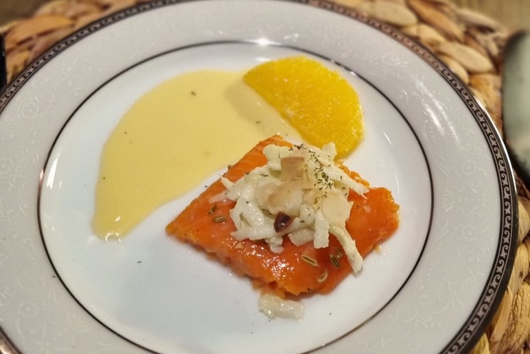 Setjið bleikjuna í eldfast mót saltið flökin og bætið fennelfræjum yfir og hellið svo olífuolíu yfir þannig að hún þekji fiskinn. Skerið sítrónu í báta og leggið í olíuna, setjið inn í ofn við 60 gráður í 50 mín. Takið út og hellið olíunni af.
