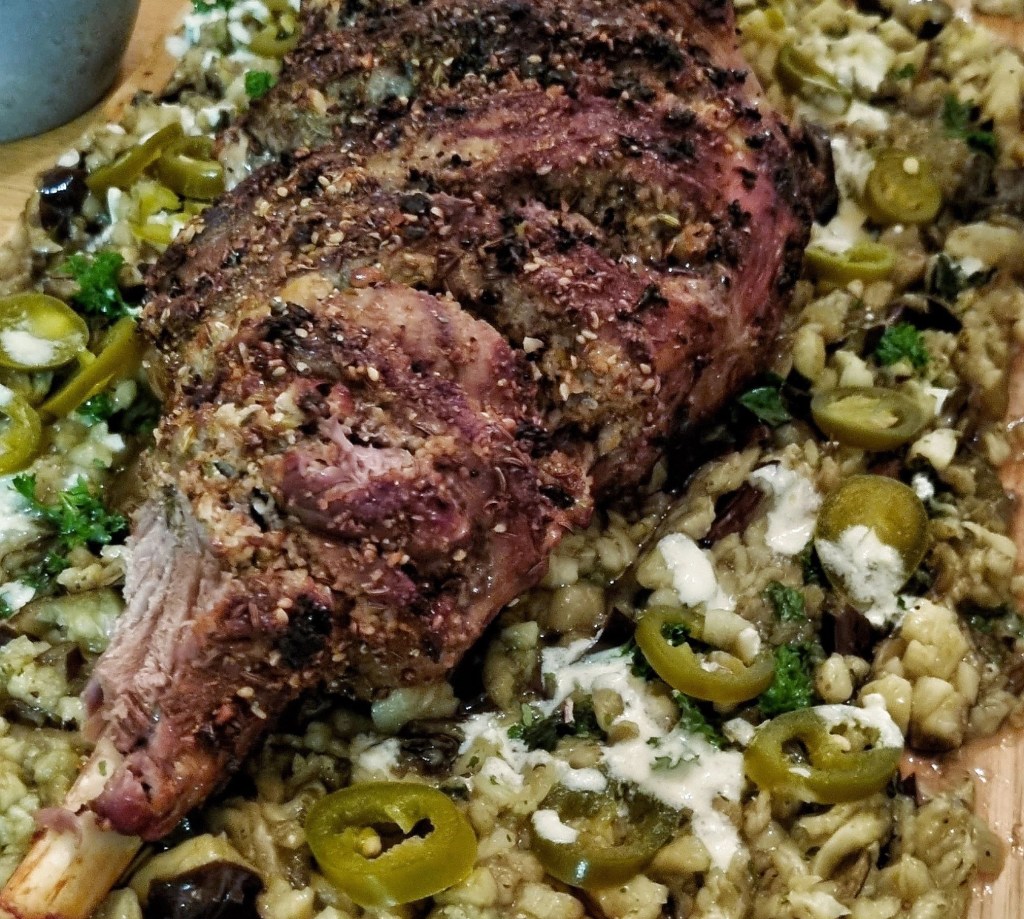 Takið fram lambalærið, skerið rákir í lærið, þvert á stefnu beinsins. Skerið alveg inn að beininu með 2 cm millibili. Gerið eins á hinni hliðinni. Smyrjið svo marineringunni á lærið og látið það fara ofan í alla skurðina líka. Takið fram eggaldin (3-4 stk) og stingið gat á þau svo þau springi ekki í ofninum. Setjið í djúpa ofnskúffu eða bakka, takið fram hvítlaukinn (2 heila) og skerið í tvennt og setjið inn á milli eggaldinanna með skurðsárið upp.