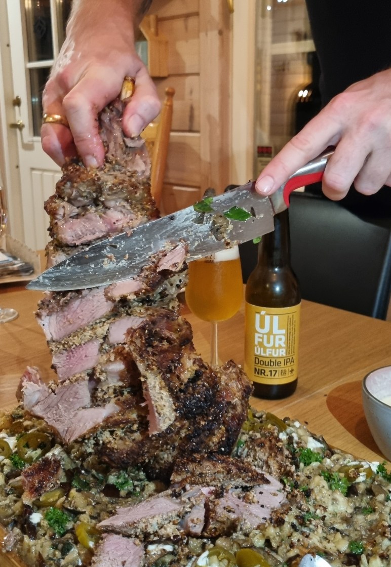 Ég fékk svo gefins smá bjór um daginn frá Borg Brugghús og datt í hug að prófa að para við lambið. Garún imperial stout vissi ég að kæmi vel út með svona ofngrilluðu lambakjöti en mér fannst spennandi að sjá hvernig Úlfur Úlfur kæmi út, double IPA, sætur en þróttmikill með mikla beiskju. Venjulega nota ég belgískan tripel eða blond með lambakjöti en það væri líka alveg fullkomin pörun hér, t.d. Westmalle Tripel. En nóg um það, sjáum hvernig þetta gekk!