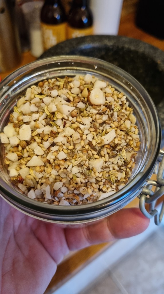 • Dukkah kryddblanda. Herslihnetur saxaðar, kóríanderfræ, fennelfræ, kúmen og sesamfræ, smá salt. Hlutföll, ca sama magn af öllu