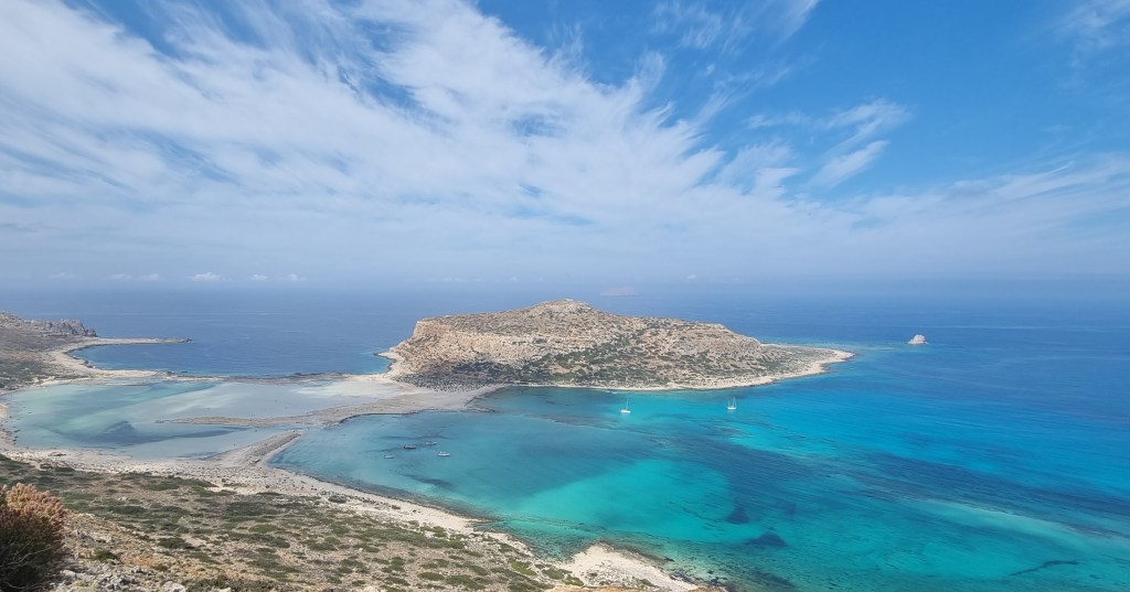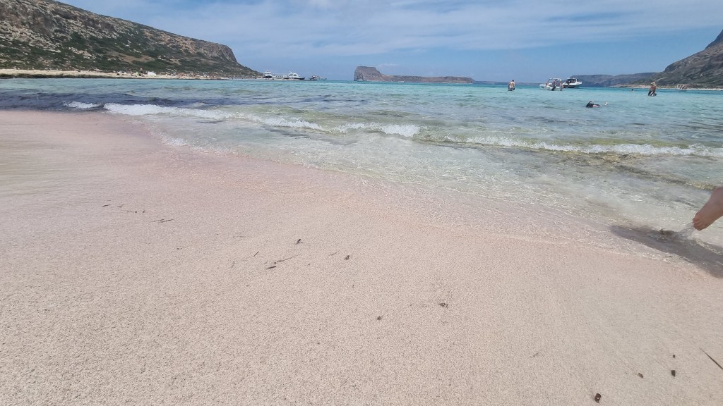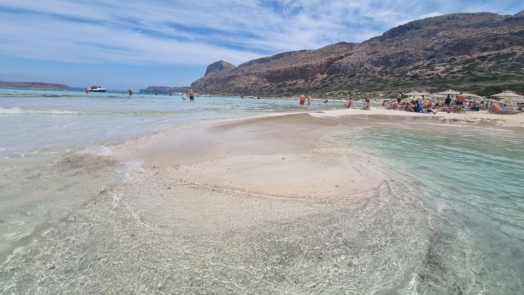 Balos er ein af þeim ströndum sem þú verður að skoða á Krít. Hún kemur fram efst eða næst efst á lista yfir strendur á Krít enda á hún það sannarlega skilið blessunin. Þetta er einfaldlega fallegasta strönd sem ég hef komið á og hef ég skoðað þær nokkrar í gegnum tíðina. Það sem gerir hana svona magnaða eru nokkur atriði, best að skoða líka myndirnar hér. Það hversu afskekkt hún er gerir hana spennandi, það er enginn bær eða þorp sem liggur við ströndina heldur taka brattar fjallshlíðar við af sandströndinni. Sum staðar eru grjóthnullungar út í vatninu sem greinilega eru tilvaldir staðir fyrir ljósmynd “litla hafmeyjan” style en það voru ófágar konur sem komu sér fyrir uppá þessum grjótum til að pósa fyrir myndavélarnar í alls konar stellingum. Það er ekki til svona mynd af mér samt. Hluti af Balos ströndinni liggur að grunnu lóni, þar nær sjórinn upp að hnjám þannig að maður getur vaðið þvert yfir lónið sem er líka vel heitt og notalegt. Botninn er hvítur og í fjarlægð virðist fólk vera að vaða mjólk upp að hnjám, Hinu meginn mætir ströndin svo opnu Miðjarðarhafinu með þessum dáleiðandi túrkisbláa sjó. Balos er líka ein af bleikuströndum Krítar en í sannleika sagt þarf að hafa smá fyrir því að sjá bleika litinn en á sumum stöðum er samt alveg smá bleikt svæði sem kemur ægilega vel út á mynd.