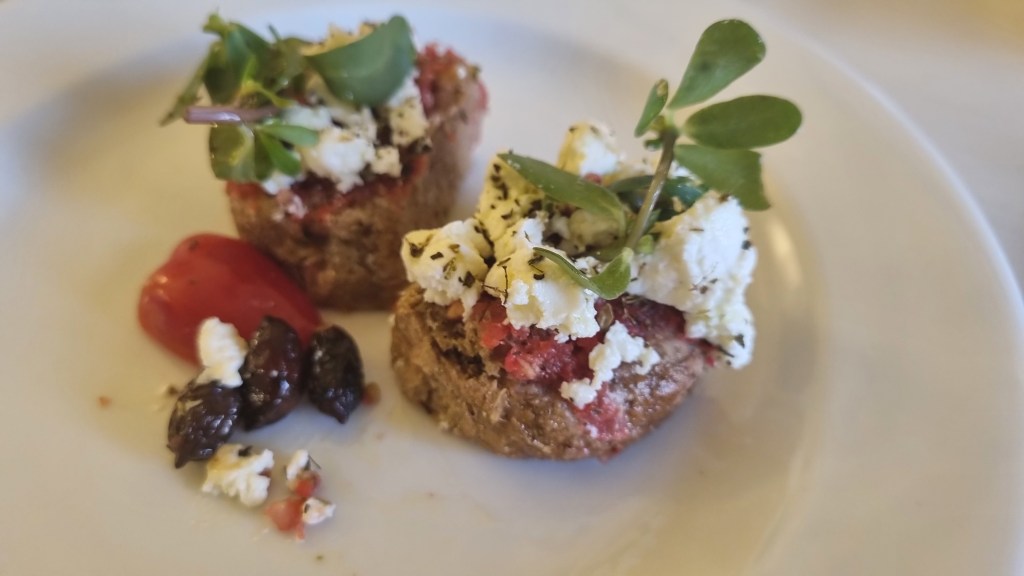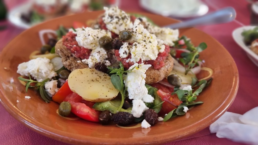 Dakos. Þetta er flott sem forréttur eða bara smá biti með góðum bjór eða víni. Dakos er dálítið eins og þurr brauðbolla skorin til helminga og sem minnir á brauðtening í áferð, ofan á þetta eru svo hakkaðir tómatar, krydd og grískur feta eða mizithra ostur. Mjög létt og þægilegt.