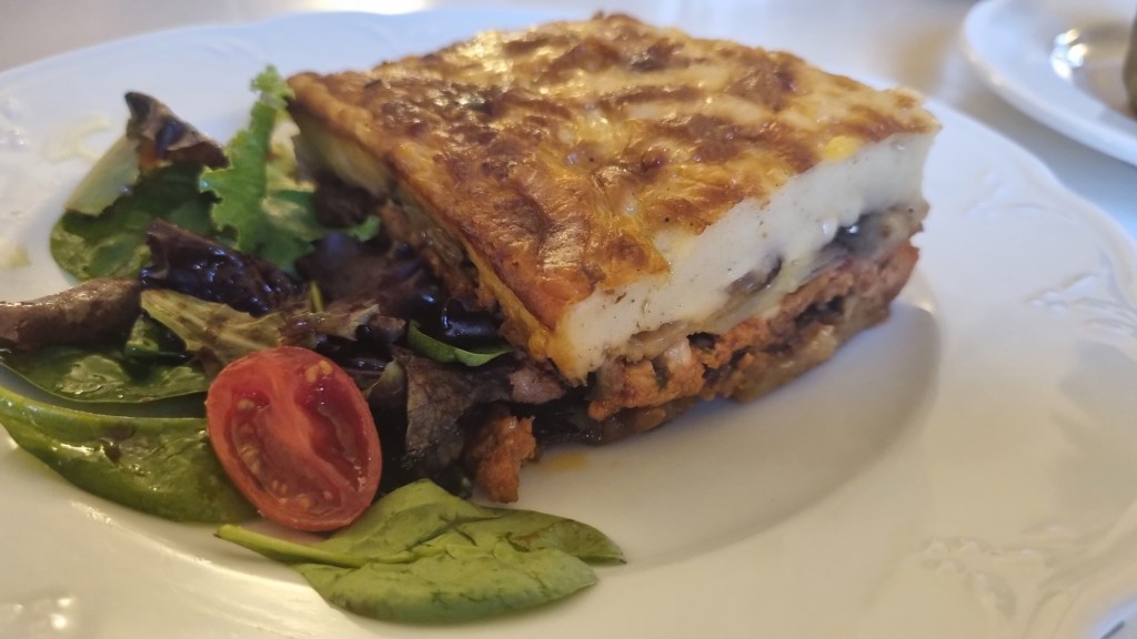 Mouzakka er líklega með þekktari grískra rétta og er algjört möst að smakka. Ekki bara einu sinni því útgáfurnar eru mismunandi á milli veitingastaða. Uppistaðan í þessu eins konar lasagne eru kartöflur í skífur sem eru annað hvort steiktar í ofni eða djúpsteiktar og þeim svo raðað í eldfast mót. Eggaldin í sneiðum og svo nautahakk eða blanda af lamba og nautahakki. Þetta er lungnamjúkt, bragðmikið og dásamlegt. Þetta er eitthvað sem við munum reyna við heima á Íslandi.