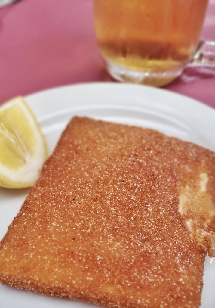 Saganaki. Ef þér líkar ostur þá munt þú elska þennan rétt. Saganaki er djúpsteiktur ostur, oftast gruyere eða feta eða annar ostur sem bráðnar vel. Með þessu fylgir ferskur sítrónubiti sem er kreistur yfir ef maður vill. Einfalt en gott, ég mæli líka með að borða þetta með tzatziki. Þetta er fullkominn biti fyrir máltíðina eða bara sem snarl með ísköldum grískum lager. Sonur minn fékk sér þennan rétta nánast í hvert mál. Við höfum svo sem djúpsteikt ost heima en hér eftir mun ég reyna að negla þetta þegar heim er komið. Vandamálið er líklega gæðin á ostinum heima?
