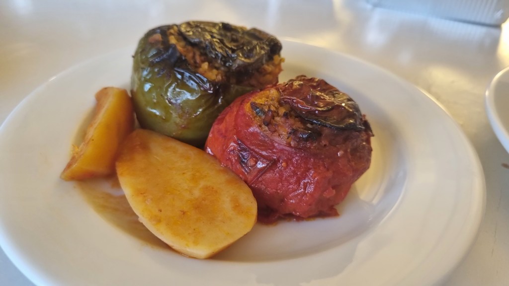 Gemista/Yemista. Gemista er mjög vinsæll réttur, þetta er í raun fylltur bakaður tómatur eða papríka. Fyllingin getur verið alls konar, klassístk hrísgrjón eða risotto, fíntskorið grænmeti og stundum hakkað nauta eða grísakjöt. Þetta er svo bakað í ofni með eins konar marinara sósu. Í raun er ekkert rétt eða rangt í þessu, aðal málið er að fylla þetta grænmeti og baka.