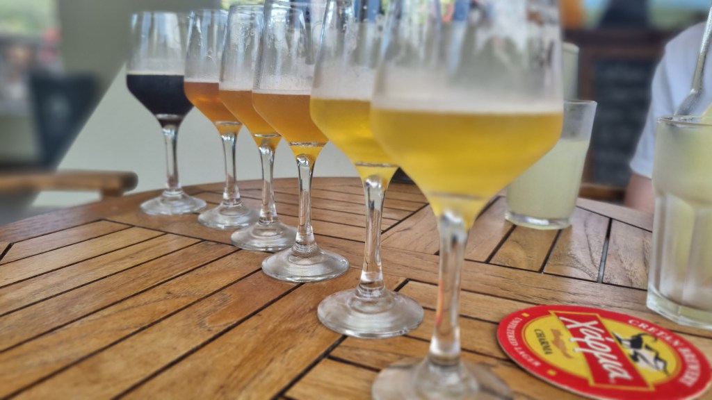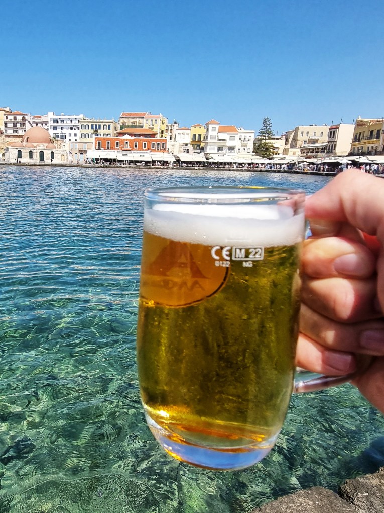 Bjórinn á Krít. Verum hreinskilin, Grikkir eru ekki þekktir fyrir bjór og myndi ég ekki vera að eltast sérstaklega við hann hér. Þeir gera ágætis ljósan lager sem er ofsalega þakklátur í hitanum. Ískaldur ljós lager af krana í 28 stiga hita er bara æði. Heima á Íslandi myndi maður sennilega hella honum í vaskinn. Það er samt sem áður smá von fyrir hörðustu bjórnördana því skammt frá Chania eða 25 km vestur af borginni er handverksbrugghús sem kallar sig Cretan Brewery.