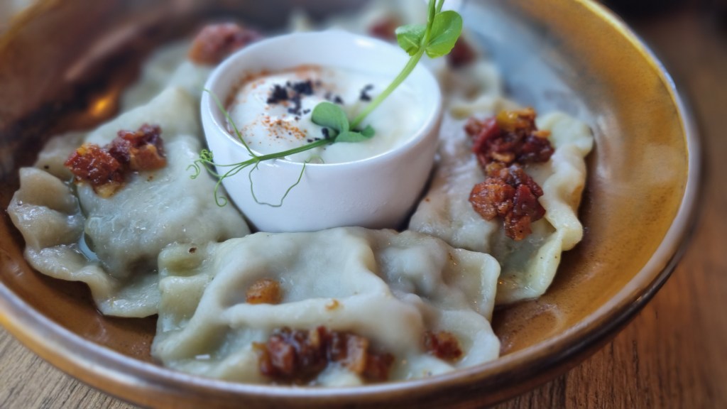 Við pöntuðum arancini til að deila. Ég hef borðað arancini marg oft en þessi réttur var líklega sá fallegasti til þessa. 3 fullkomnar stökkar kúlur í basil olíu og með berjasultu, framsetning sem ég er ekki vanur. Glasið af orange víninu kostaði dálítið, eða 48 zloty eða rétt undir 1500kr. Við enduðum líka ferðalag okkar með hádegisverði á Geneza og vorum ofsalega sátt. Ég mæli með bökuðu fíkjunum fylltum með rjómageitaosti og hunangi, svakalegt og öskrandi góð pörun við orange vínið. Ég pantaði líka gnocci sem var ofsalega gott með bragðflækjum sem við höfðum aldrei smakkað áður, sætt, súrt og rjómakennt allt í senn. Hér fengum við okkur líka dumplings fyllt með langelduðu rifnu andakjöti, svakalega gott en svona dumplings er klassíker í pólskri matarmenningu.