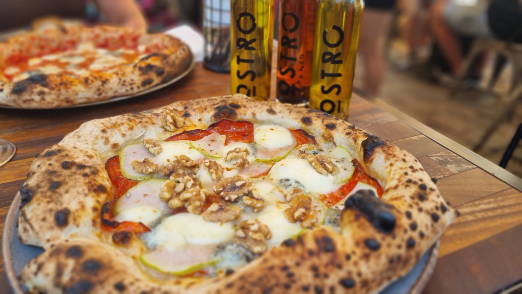 Hinn staðurinn er líka við ánna, en bara hinumeginn alveg við litlu hreyfanlegu göngubrúnna. Ostro heitir hann, hann er ítalskur og valinn nr eitt af ítölskum stöðum á svæðinu ef maður treystir internetinu. Ostro er mun ódýrari staður enda sérhæfir hann sig í eldbökuðum flatbökum þannig að ef þú ert pizza aðdáandi þá skaltu ekki missa af þessum stað. Reyndar þó þú borðir ekki einu sinni pizzu þá muntu elska þessar, það getur bara ekki annað verið. Með bestu pizzum sem ég hef smakkað. Við erum að tala um fullkomlega bakaðar súrdeigs pizzur, maður gæti í raun sleppt öllu áleggi og borðað botninn einan og sér en ekki gera það samt, álegið er svo geggjað líka. Pizza nr 11 var stórkostleg, bianco með ítölsku salami, þunnum peruskífum, gorgonzola, mozzarella og valhnetum. Hin pizzan var nr 5 minnir mig,bragðmikil gorgonzola pizza sem sveik ekki. Á matseðlinum er vert að taka eftir vínpöruninni sem þeir mæla með fyrir neðan hverja pizzu, hvort sem er hvítt eða rautt. Skemmtilegt.