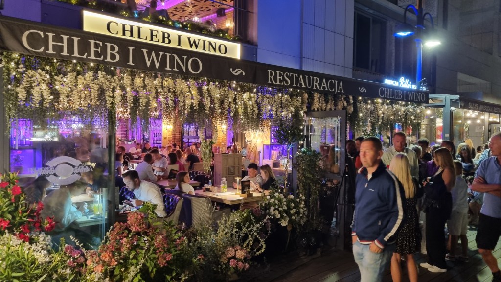 Við tókum svo eftir öðrum stað þarna við ánna sem vakti áhuga okkar aðallega vegna þessa að fyrir utan var alltaf löng biðröð af fólki sem freistuðu þessa að fá borð síðar um kvöldið en það þarf að bóka borð þarna með löngum fyrirvara. Staðurinn heitir Cheleb in Wino, hjómar eins og Seleb í glasi en þýðir held ég brauð og vín. Ég veit ekkert hvort þetta er góður staður eða þess virði að hanga í röð fyrir en hann sker sig alla vega mjög úr þarna við árbakkann með þessa röð fyrir framan og svo er allt húsið upplýst í fjólubláum lit og mikil stemning. Lofar góðu en ómögulegt að segja nema prófa sjálfur.