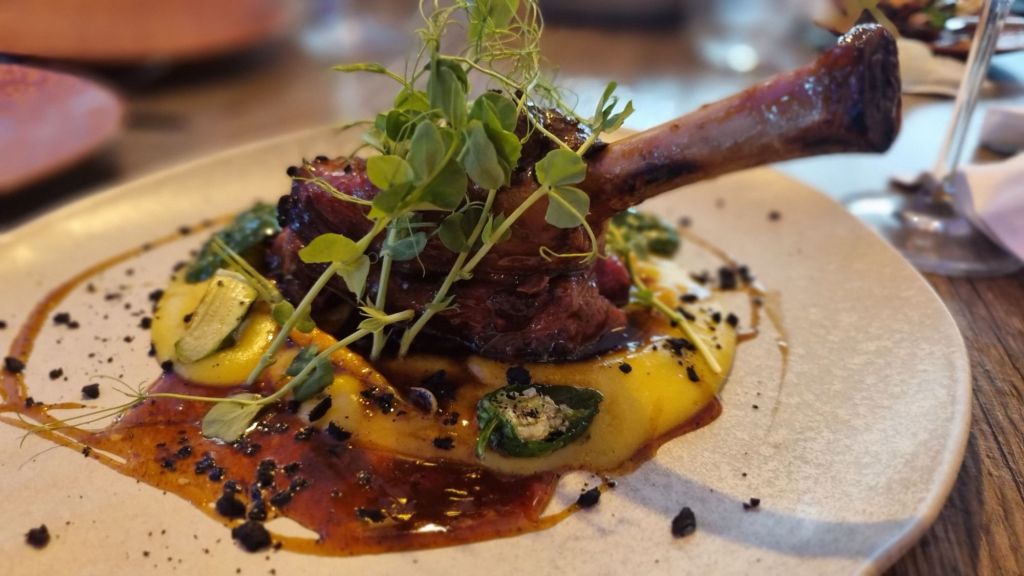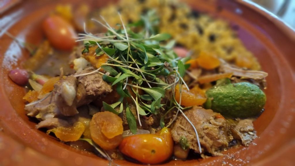 Kjúklingavængirnir voru mjög góðir, með mismunandi majonesi og svo fékk sonurinn grilluð kjúklingaspjót sem komu fram hangandi á gálga logandi í eldi. Mjög gott stöff. Ég fékk mér algerlega magnaðan hægeldaðan lambaskanka og konan fór í langeldað lamba tajine. Ég myndi fá mér aftur lambaskankann næst og reyndar hummus plattan líka. Við innsigluðum þetta svo með áhugaverðum eftirrétt sem kom skemmtilega á óvart.