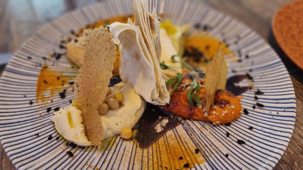 Ég sé ekki eftir því að hafa ákveðið að skoða Los Christianos og borða þar. Bærinn er svo sem allt í lagi, ekkert sértakelga næs eða eitthvað sem maður myndi vilja eltast við en Zoco er hins vegar vel þess virði að skoða. Við tókum leigubíl frá hótelinu okkar á adeje og kostaði það um 11 evrur. Röltum svo um aðeins í bænum og fundum svo Zoco sem er verðlaunaður modern líbanskur staður. Þetta er notalegur snyrtilegur staður, þjónusta frábær og maturinn algerlega geggjaður. Allt “wibe-ið” minnir um margt á michelin! Maður fær t.d. litlar sítrónu handþurrkur fyrir matinn og svo heita þvottapoka innsiglaða í poka eftir mat. Mikið af réttunum gerir ráð fyrir að maður noti hendurnar til að matast þannig að það er gert ráð fyrir smá subbuskap. Við fengum svo lítinn smakk rétt fyrir matinn, blómkáls mús með smá geitaosti og kóríander. Mjög gott.