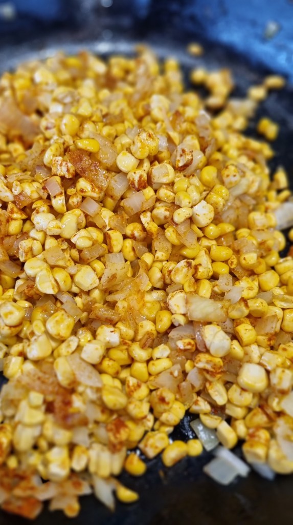 Saxið einn lauk smátt og mýkið á pönnu í olíu og smjöri á meðalháum hita. Ca 5 mínútur, skafið svo maískornin af maískólfunum (2 bollar) og bætið á pönnuna ásamt 1-2 tsk hvítlauksmauk og svo teskeið af kryddblöndunni. Hrærið þetta saman og látið malla þar til maís er orðinn mjúkur. Ég bætti reyndar slatta af smjöri saman við, það er bara svo ljúft að steikja úr smjöri. Það tók mun lengri tíma en 5 mín að mýkja maísinn hjá mér. Saltið og piprið eftir smekk.