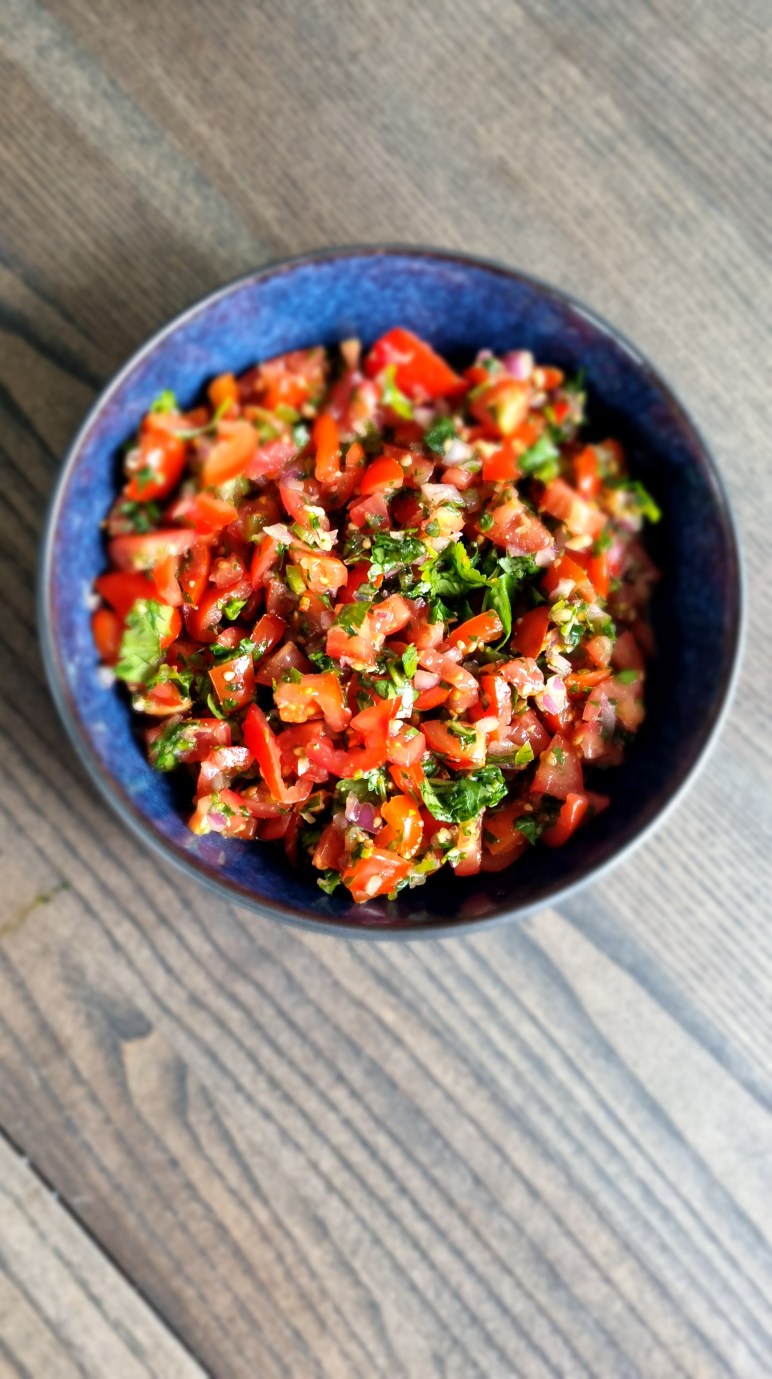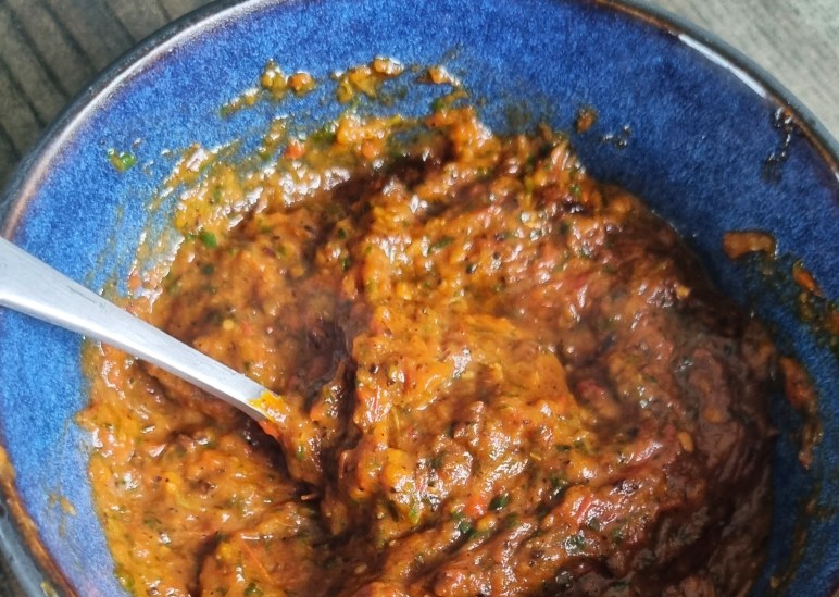 Takið fram elfast mót, stillið bakarofn á 210. Skerið tómata í tvent (250 g) og raðið í mótið, afhýðið hvítlauksgeirana (4 stk), skerið eina sæta langa papriku í tvent eftir endilöngu og setjið með sárið niður í mótið. Sama með 2 fersk chilli nema að fjarlægið fræin. Laukur er skorinn gróft í nokkra bita og líka settur á mótið. Svo er bara að baka þetta í ca 10 mín eða þar til kominn bruni á grænmetið. Þið ráðið auðvitað hversu mikið “char” þið viljið hafa.