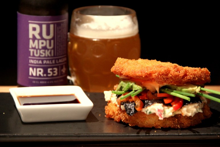 Sushi borgari með krabbasalati og ljómandi lager bjór