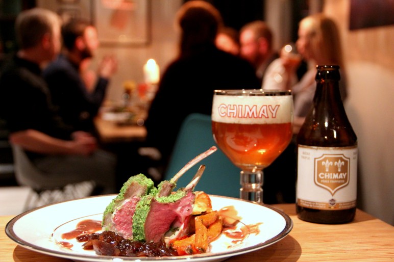 Lungnamjúk lambakóróna í heiðgrænum kryddhjúpi með belgískum Trappist bjór